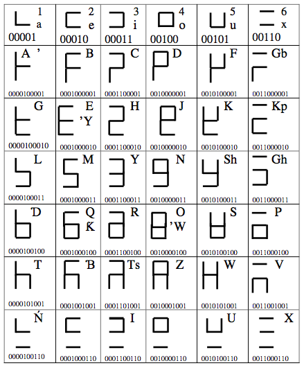 Five-unit binary numbers are required to represent the 16 digits of Tafi writing. These can then be combined in twos to give the 36 consonants as ten-unit binary numbers. The five-unit binary numbers representing the vowels and the ten-unit numbers representing the consonants of Tafi writing are shown in Figure 36 below: