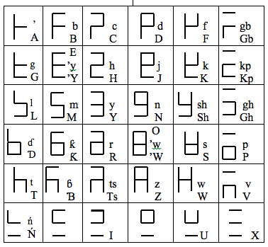 This is just for the reader to see how Square Tefi Writing looks. The corners may be rounded to produce Rounded Tafi Writing. Note the space above a vowel, left for indication of tone and length of the vowel. Indication of tone and length of a vowel may be required for Hausa, Igbo and Yoruba.