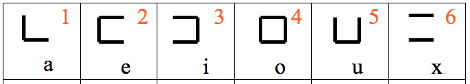 The 6 digits stand as the primary vowels: a, e, i, o, u and x. As a vowel, the first digit | is written with a ‘tail’ _ as |_ = a, to show that writing is from left to right. Each vowel is sounded by its name. Knowing the shape, name and sound value assigned to each vowel is the first stage for a child in learning to write and read in Tafi.