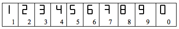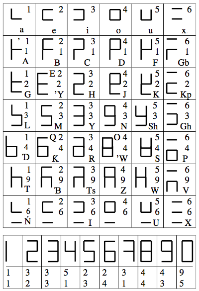 A vowel has one (right-hand) number and a consonant has two numbers, a top (left-hand) number and a bottom (right-hand) number. Zero (0) indicates ‘no digit’.