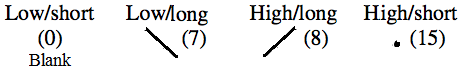 A stroke or dash is two or three times the length or width of a dot. A letter or numeral is identified by the combination or orientation of the 7 horizontal and vertical strokes, with the dots standing as guiding points.