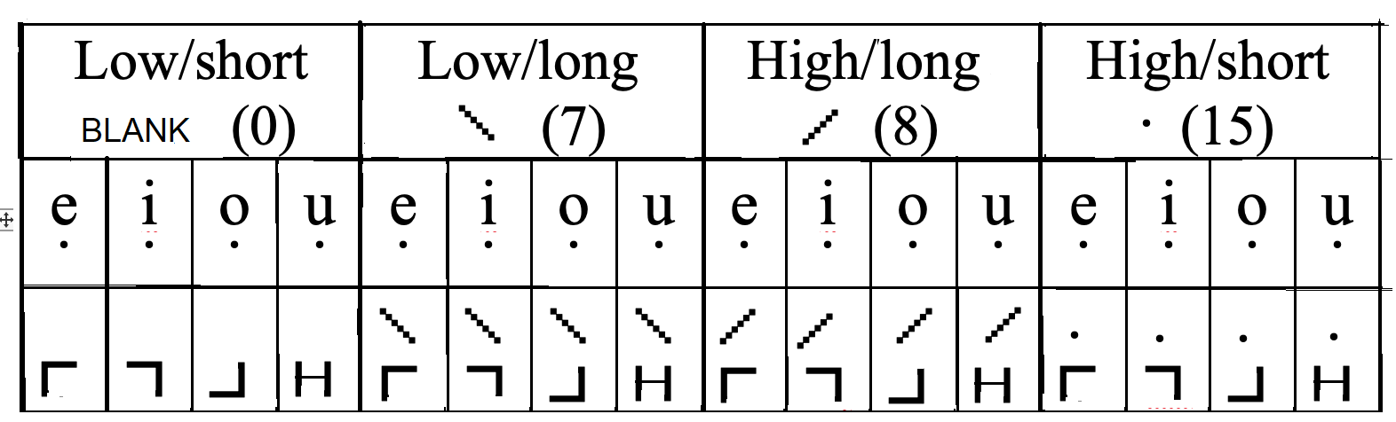 *Each mark or symbol has two numbers, top and bottom number. For the tone of a vowel, it is a number (0, 7, 8, or 15) above ‘x’ for the tone.