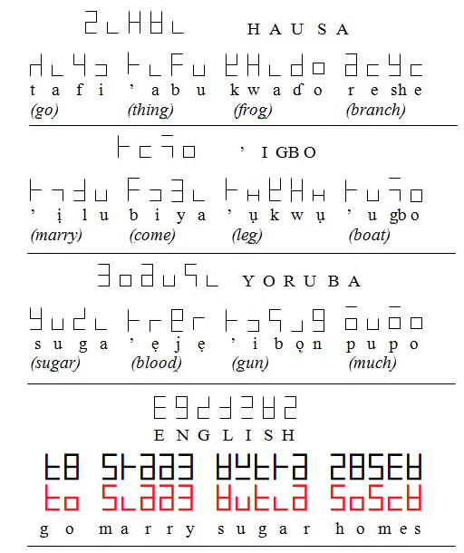 An example of Tafi Writing, which can be executed with pencil and ruler, is given in Figure 7 below, with some words in Hausa, Igbo, Yoruba and English.