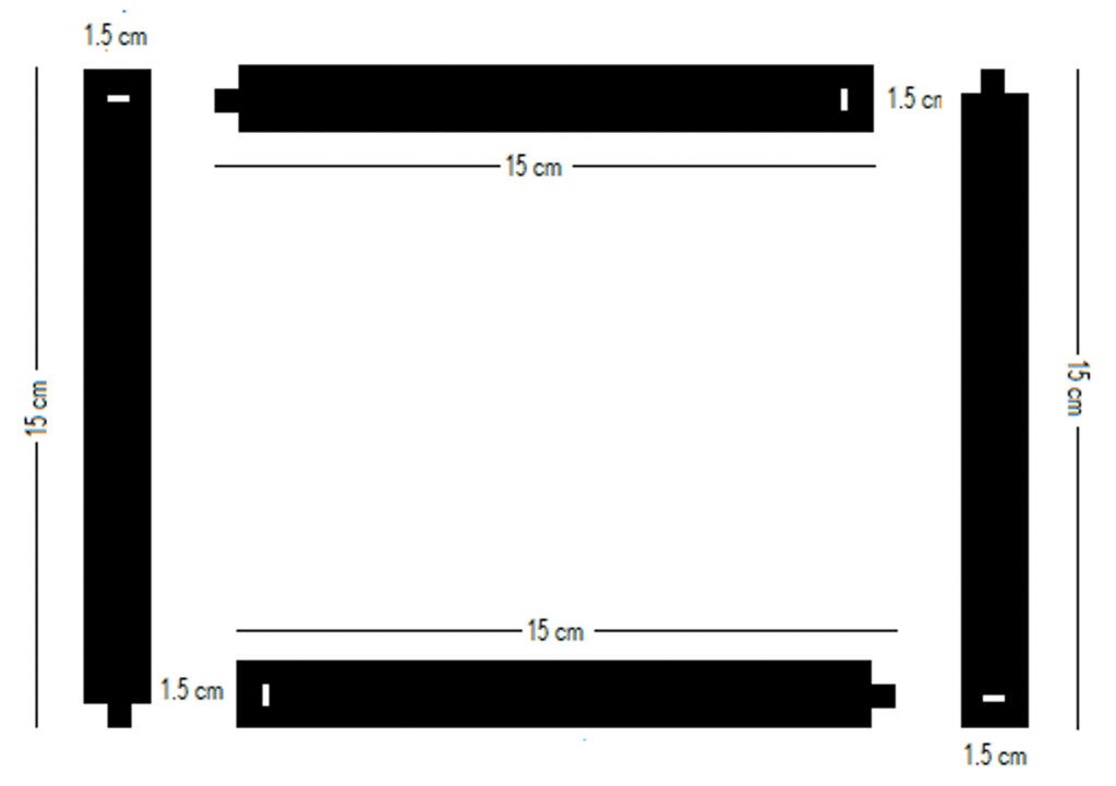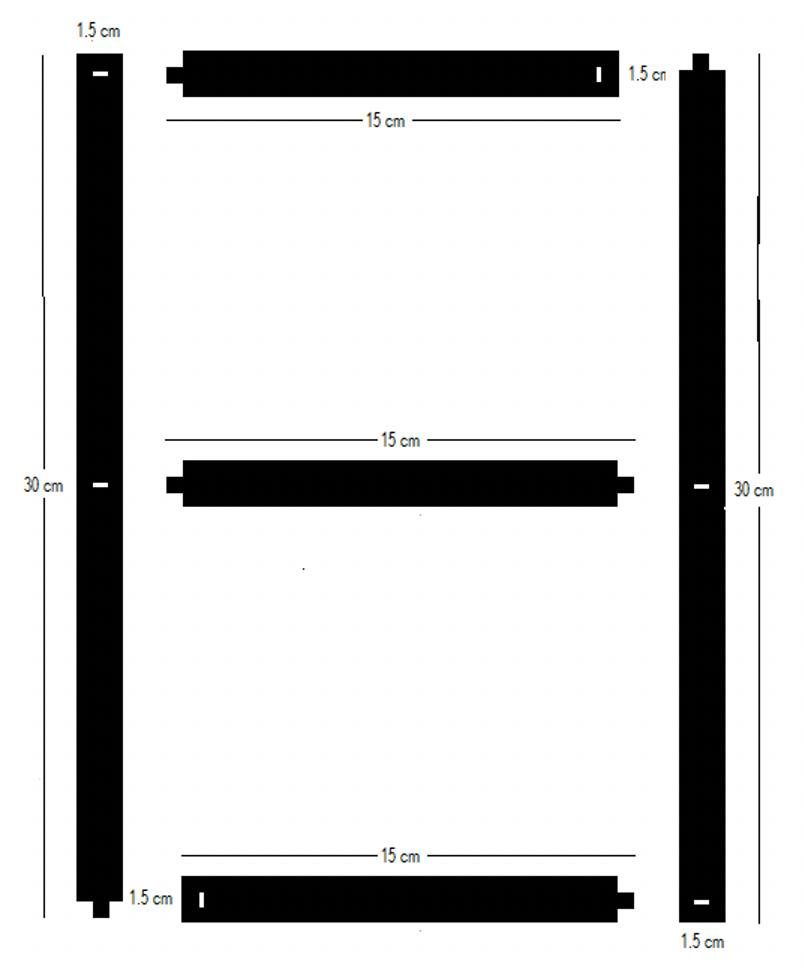 These are flat plates or sheets of metal, plastic or wood, two long ones each measuring 1.5 cm by 30 cm and three short ones (males) each measuring 1.5 cm cm by 15 cm, as shown in Figure 24. The two long plates have (vertical) slots (slits) at the ends and in the middle. Each of the three short plates (males) have a peg (ear) at the ends for fitting into the (vertical) slits of the longer plates (females), to construct the consonants and numerals. Working with the four Tafi sticks (Figure 24), the long and short plates can be joined, one to another, at right angles, to form the Tafi consonants, and numerals, close syllables and some open syllables, in a two-dimensional frame.